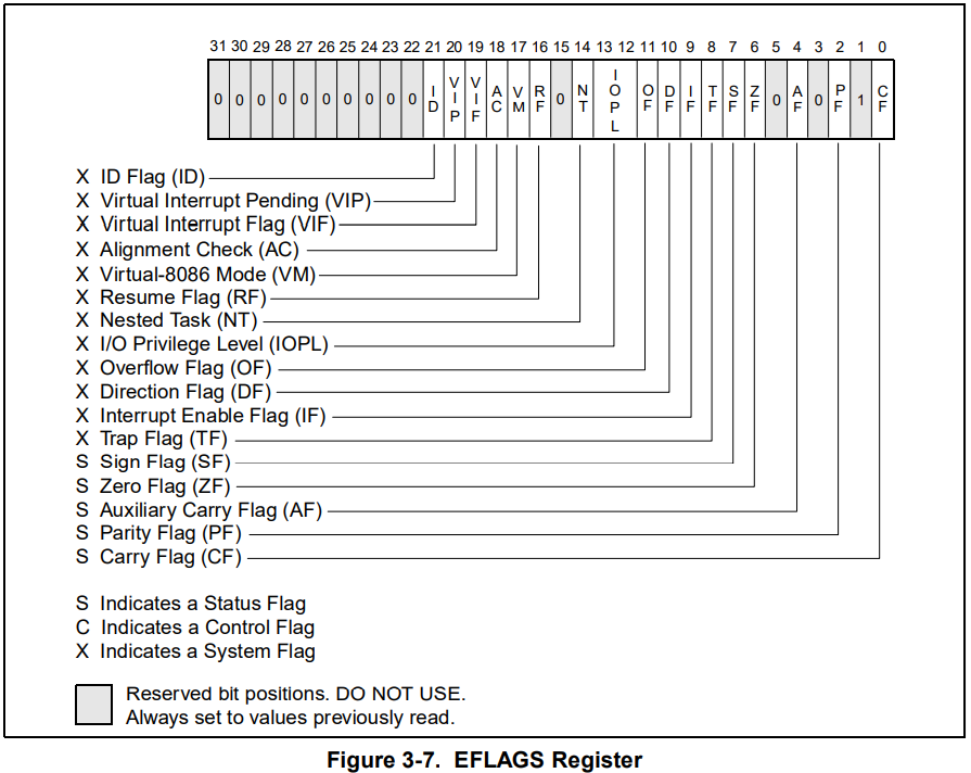 명령어의 결괏값에 따라 EFLAGS 레지스터의 각 비트 값이 달라집니다. 자주 쓰이는 플래그만 살펴보면,