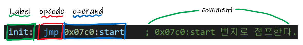 주석( Comment ) : 어셈블리 코드를 부가 설명하는 부분입니다. 어셈블리어는 CPU의 연산 과정을 매우 구체적으로 서술하는 언어이기 때문에, 사람이 해당 명령어가 무엇을 의미하고 있는지 파악하기가 상당히 어렵습니다. 그러므로, 주석을 이용하여 코드를 이해하기 쉽게 설명하는 것이 중요합니다.