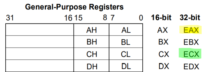 cx : 카운트 레지스터. 루프 반복의 횟수 혹은 쉬프트 연산 횟수를 저장하는 데에 쓰입니다. ecx(extended cx)의 하위 16비트. cx의 상위 8비트를 ch, 하위 8비트를 cl 이라고도 합니다.