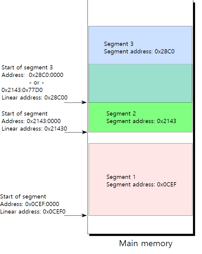 세그먼트:오프셋 = 세그먼트*16 + 오프셋 = 메모리 물리 주소