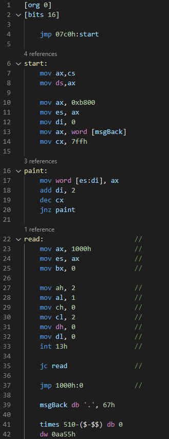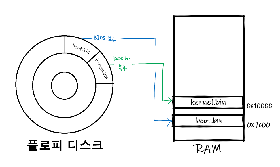 플로피 디스크 1 섹터의 크기는 512바이트입니다. 위의 코드에서는 ( line 41, 42 )를 통해 512바이트로 크기를 맞춰주었습니다. 첫 섹터에 부트로더가 기록되어 있으니, 바로 다음 섹터에 부트로더가 불러올 OS 커널이 존재합니다.