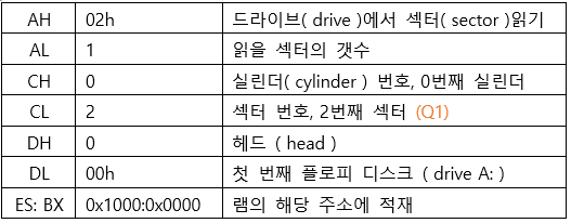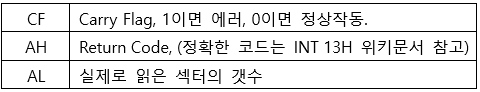 ( line 23 ~ 32 )는 int 13h 명령어를 실행하기 전, 준비하는 과정입니다. int 13h 명령어는 특정 레지스터가 입력값( Parameter )의 역할을 하여, 레지스터의 상태에 따라 수행하는 동작이 달라집니다.