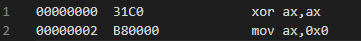 xor ax, ax : xor 연산은 자리 수마다 같으면 0, 다르면 1의 결괏값을 산출하여 오퍼랜드 1에 대입합니다. 같은 수에 대해 xor 연산을 수행하고 있으므로, ax에 0을 대입하는 연산입니다. 프로그램의 총 용량를 줄이기 위해 이런 테크닉을 사용하기도 합니다.