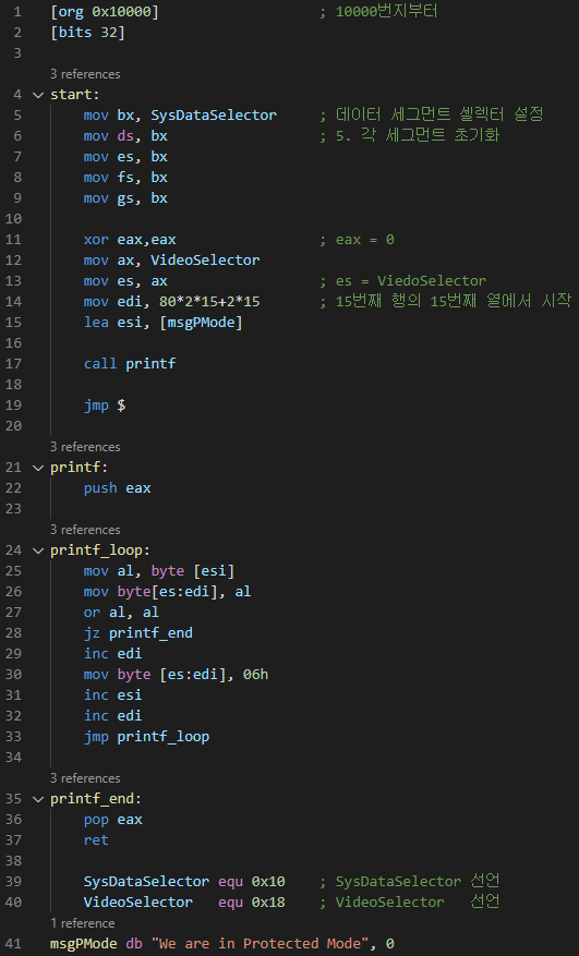 - 세그먼트 레지스터가 리얼 모드에서 썼던 값을 가지고 있기 때문에, far jump로 바뀐 CS를 제외한 나머지 세그먼트 레지스터의 값을 보호 모드에 맞게 바꾼다.
