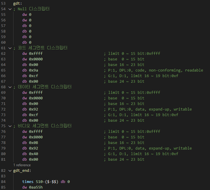 GDTR의 LSB에 gdtr이 가리키는 번지가, MSB에 48번째 비트가 들어갑니다. gdtr이 가리키는 번지부터 2바이트만큼 GDT의 크기가 저장되어 있고, 그 이후 번지부터 4바이트만큼 GDT의 시작 주소가 메모리에 담겨있습니다. GDT의 크기는 GDT의 맨 처음 번지를 가리키는 gdt포인터와 GDT의 마지막의 다음 번지를 가리키는 gdt_end포인터를 뺀 값으로 구할 수 있습니다.