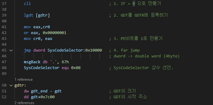 - CR0의 최하위 비트인 PE flag를 1로 만들어 CPU를 보호 모드로 바꾼다.