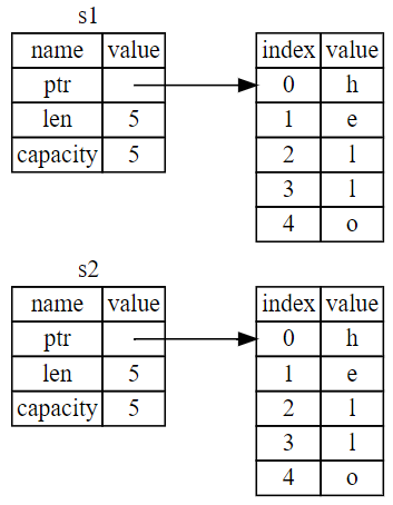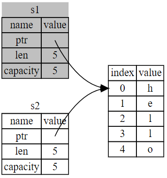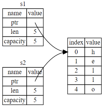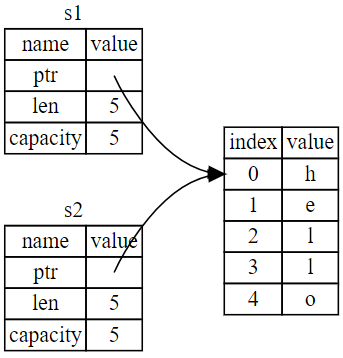 | 데이터 소유(s1) | 같은 데이터 가리킴 | 소유권 이동(s1->s2) |